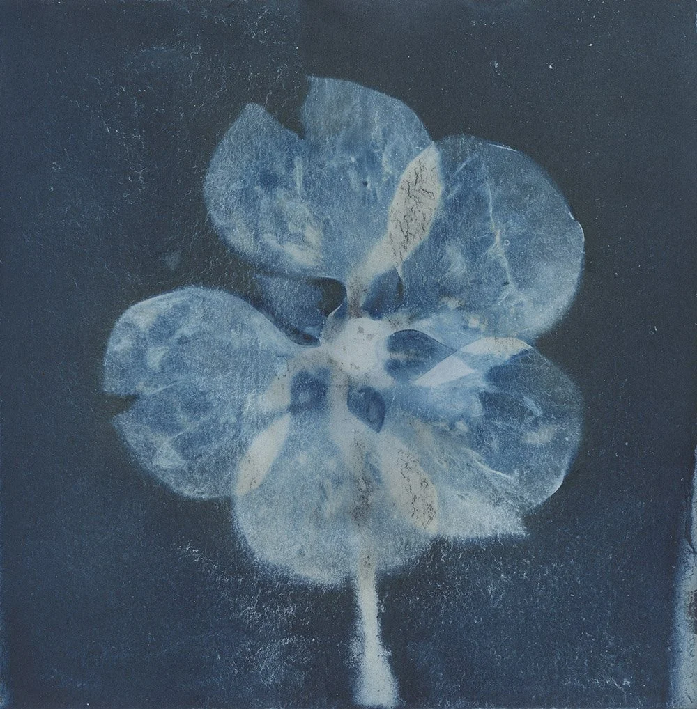 Guided by the ebb and flow of the seasons, both in terms of light and available specimens, Bryony embraces the fragility of time. She revels in the notion that each piece is time-sensitive, allowing for unexpected directions and revealing endless possibilities within the original cyanotype she produces.