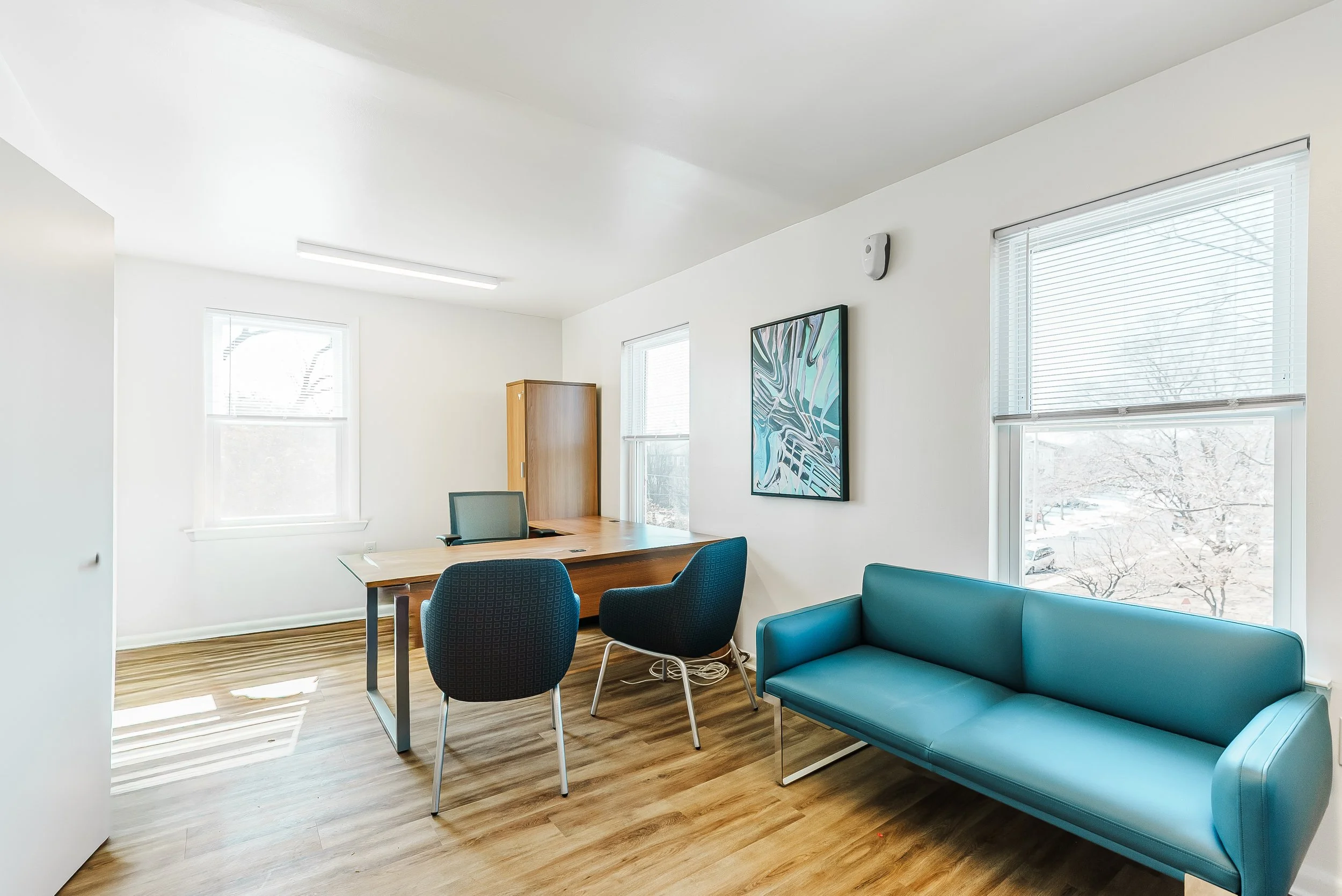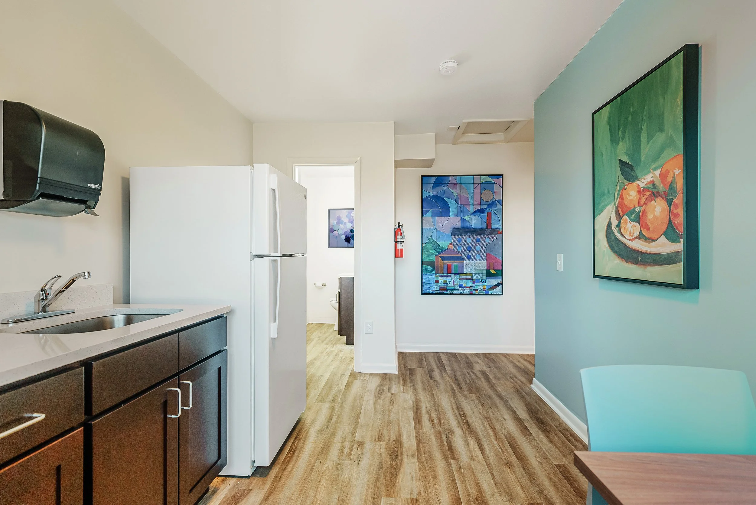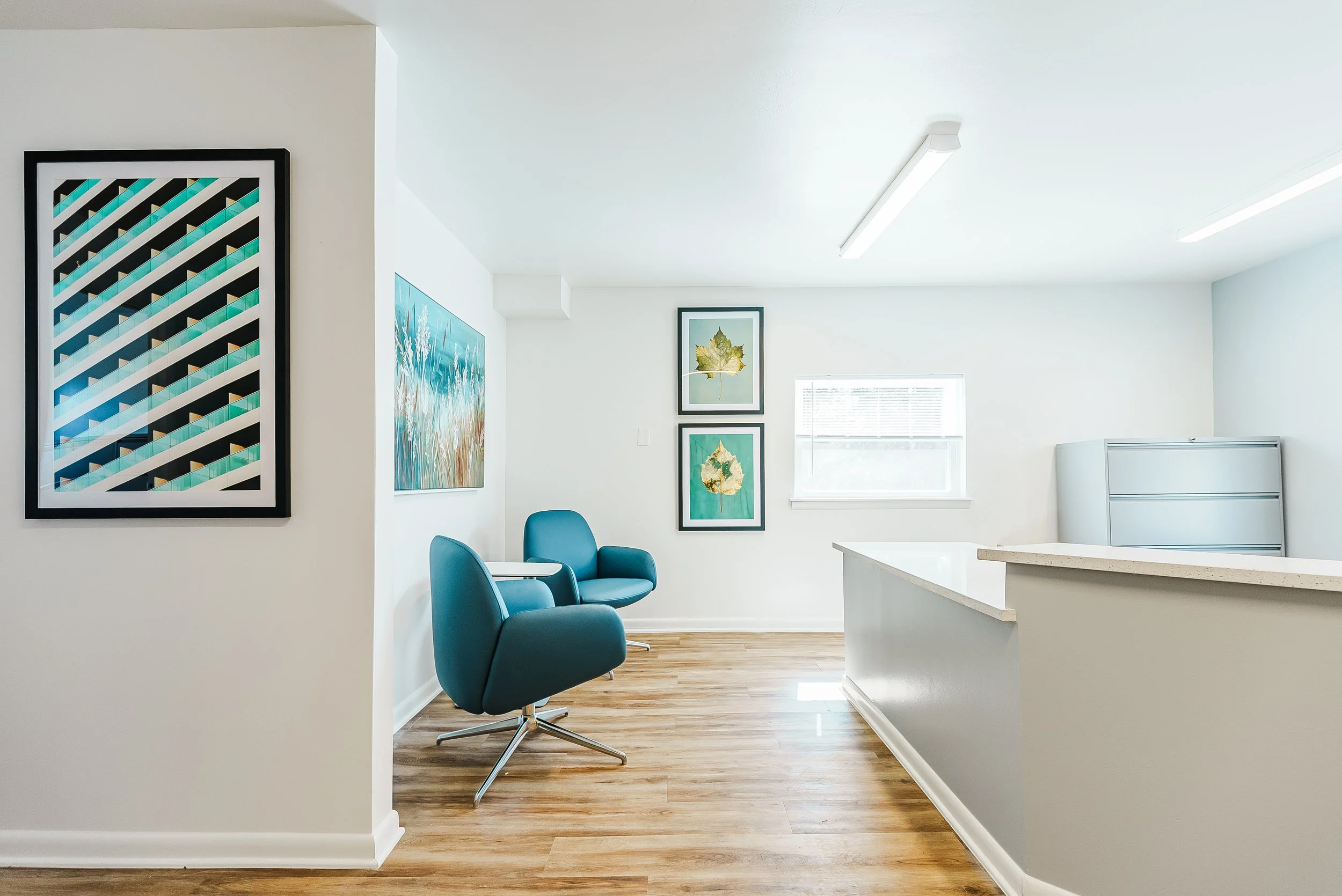 Darby Townhomes is located in Sharon Hill, Pennsylvania, just outside Philadelphia, and reflects the unique intersection of neighborhood charm and nearby urban energy that defines the area. The curated artwork collection brings together crisp botanical imagery, graphic compositions, and expressive abstract works inspired by both the quiet residential character of Sharon Hill and the vibrant artistic culture of Philadelphia. A palette of cool greens, teals, blues, and subtle metallic gold accents introduces a fresh, contemporary atmosphere throughout the community spaces. The result is a visually engaging environment that balances natural references with modern artistic expression, creating a sense of place that feels both connected to the neighborhood and energized by the creative influence of the nearby city.