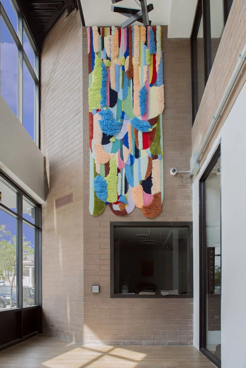 Enter the drips. Combining fibers gathered from field, sheep and those developed on a factory floor, Andersen proves that there is always room for both the vibrant and the muted, the sleek and the wild, cut and looped, soft and cumulus, the dense and the coarse; the unexpected and varied tactile quality of her pieces allow the eyes to open to an emotional one. Her work speaks to the truth that whether they are temporal, cultural, geographical, or interpersonal, boundaries inevitably bleed, and the results are often quite stunning.